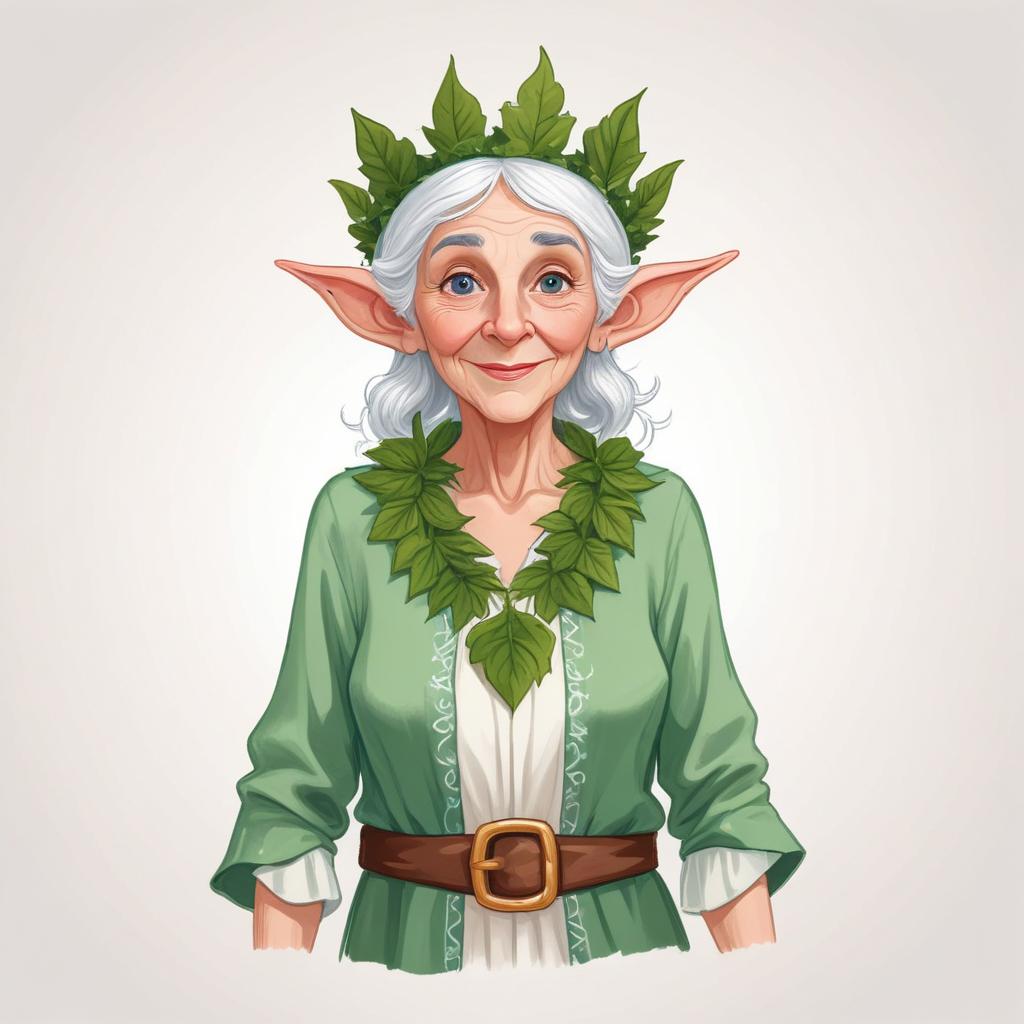 An elderly fairy stands smiling, adorned with green leaves. She embodies magic and nature, set against a soft, neutral background.