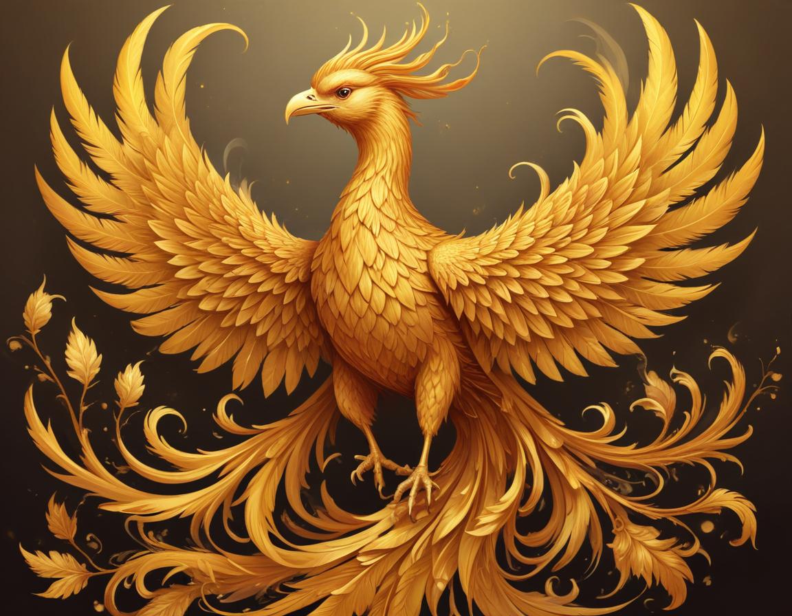 A stunning golden phoenix spreads its wings gracefully, showcasing intricate feather details, surrounded by elegant swirls on a dark background.