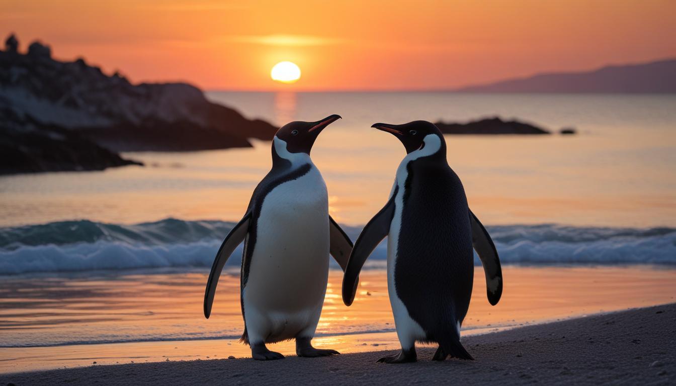 Two penguins stand together on a sandy beach at sunset, surrounded by gentle waves and a colorful sky.