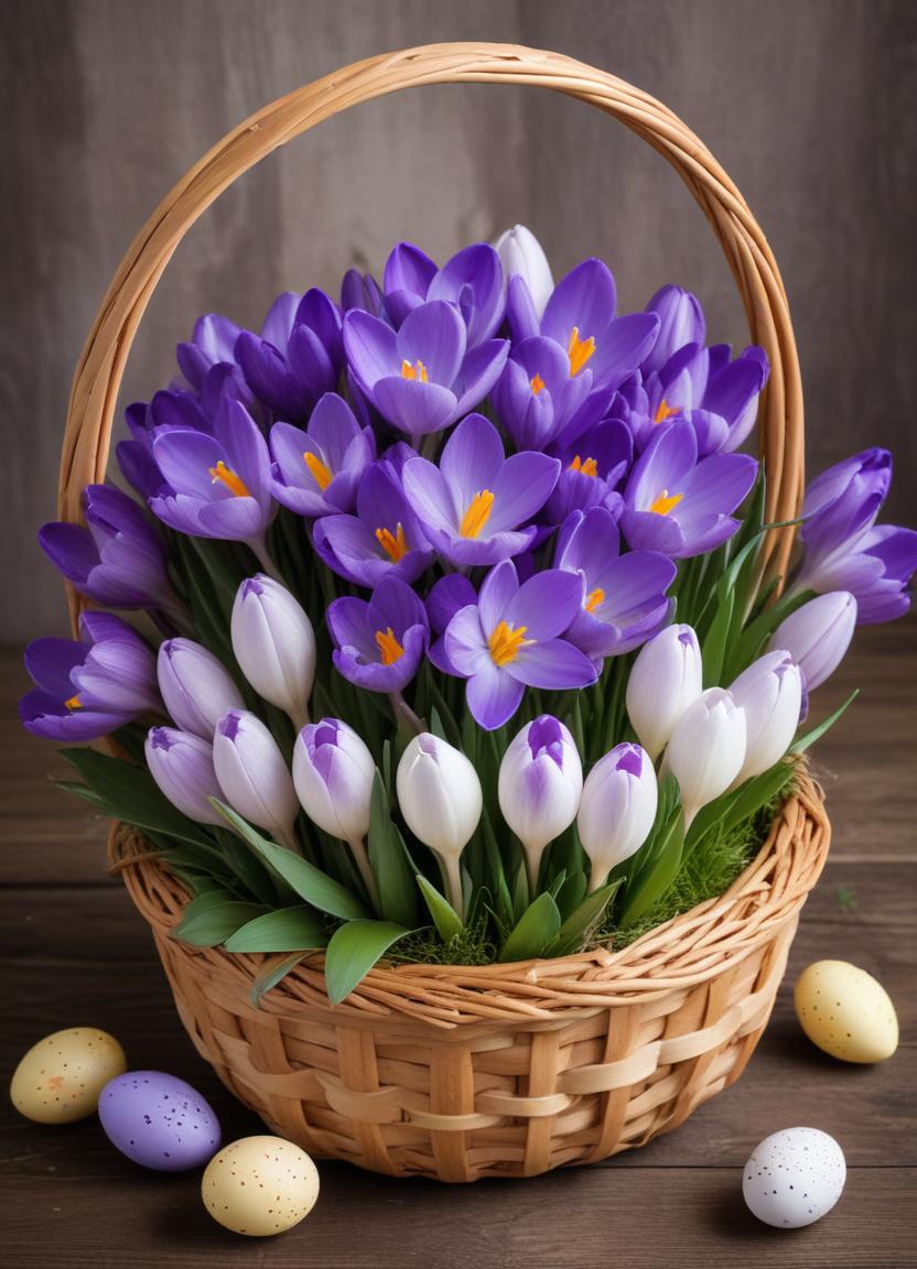 A woven basket brims with vibrant purple and white crocus flowers, surrounded by pastel Easter eggs. Fresh spring decor brightens the scene.