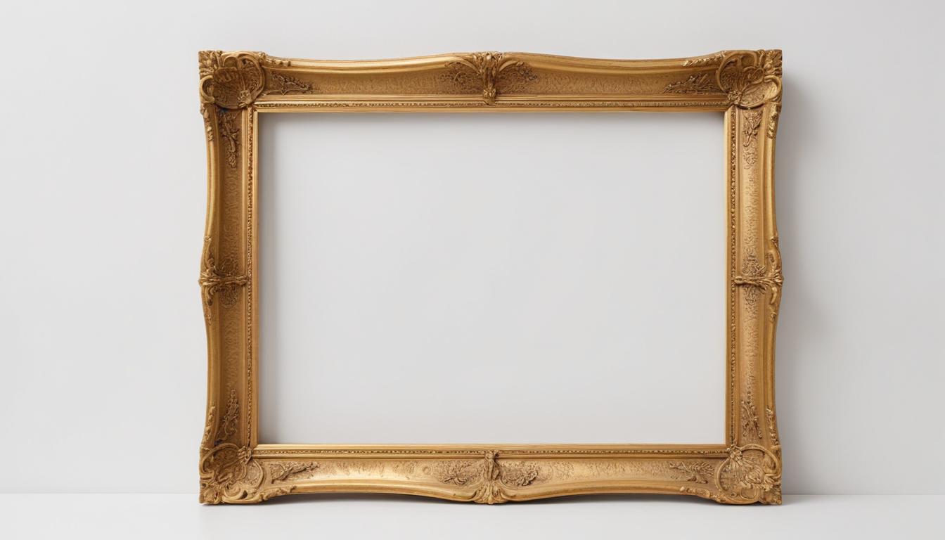 An empty golden frame sits against a plain wall, awaiting a piece of art to fill its elegant design.