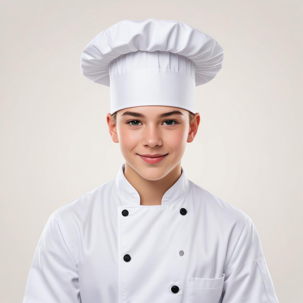 A young chef stands confidently, wearing a classic white chef coat and hat, with a friendly smile while in a kitchen environment.