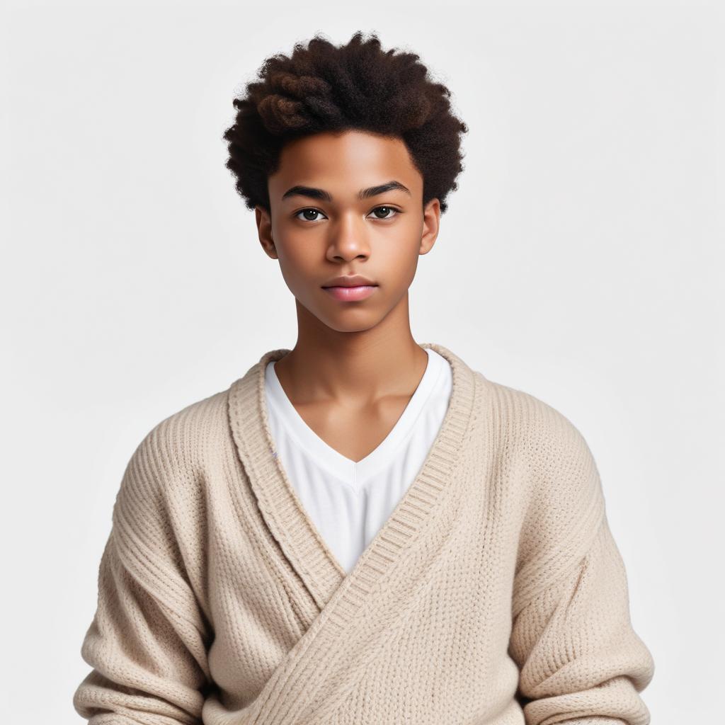 casual outfit, clean lines, comfortable clothing, cotton fabric, expressive gaze, fashion, male, modern fashion, natural look, neutral background, portrait, posed, relaxed pose, self-confidence, simple style, soft textures, studio setting, sweater, young model, youthful appearance