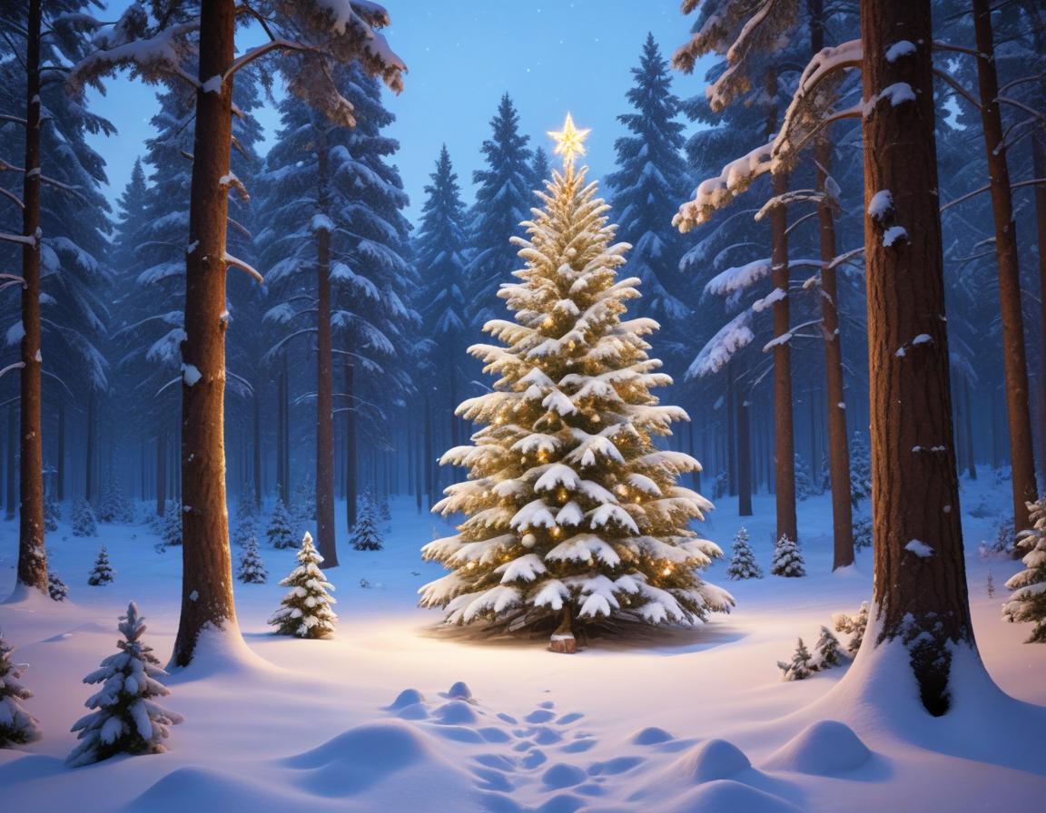 A tall Christmas tree shines in a snowy forest, surrounded by smaller trees. Soft snow blankets the ground under the evening sky.