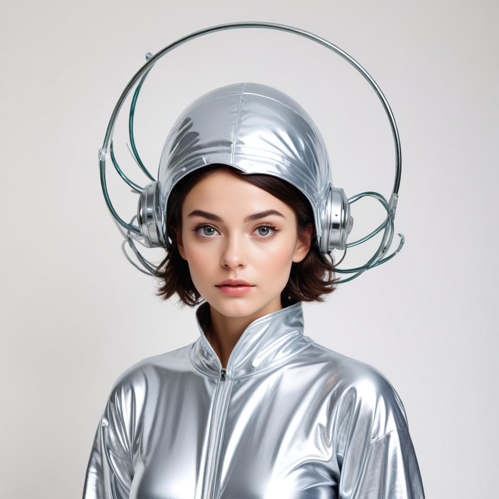 accessories, beauty, creative, design, fashion, futuristic, hair, headpiece, looks, makeup, minimalist, model, modern, outfit, portrait, silver, studio, style, technology, young