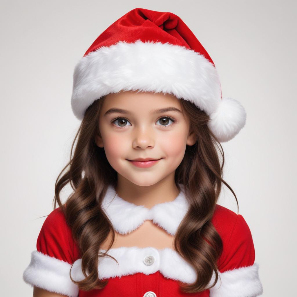 Young girl wears a red Santa hat and a matching dress. She has long, wavy hair and a joyful expression, capturing the holiday spirit.