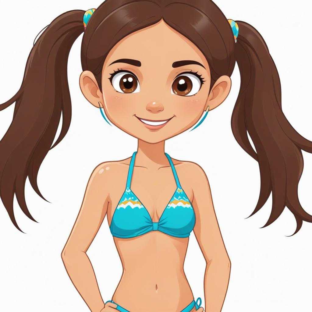 A cheerful cartoon girl with brown hair in ponytails poses confidently in a bright blue bikini, showing her playful side.