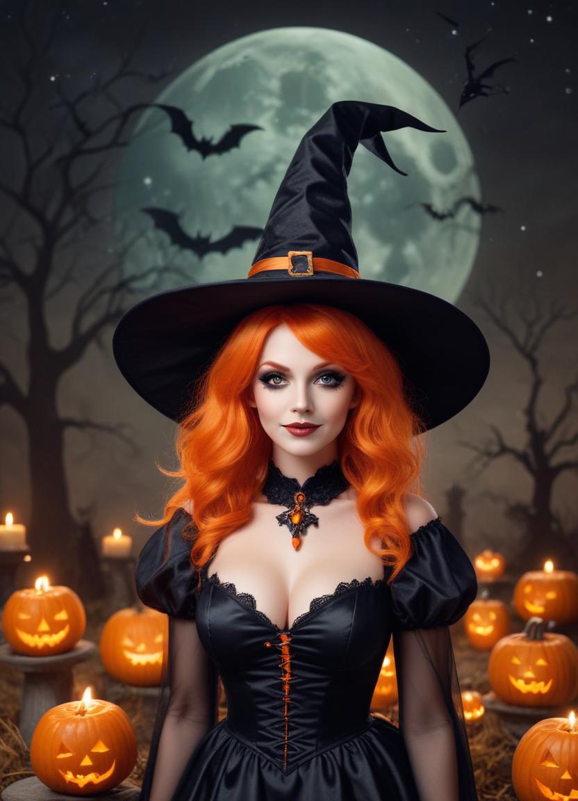 Halloween, autumn, bats, black dress, candles, celebration, costume, eerie, enchanting, full moon, graveyard, harvest, magical, night, orange hair, pumpkins, seasonal, shadows, spooky, witch