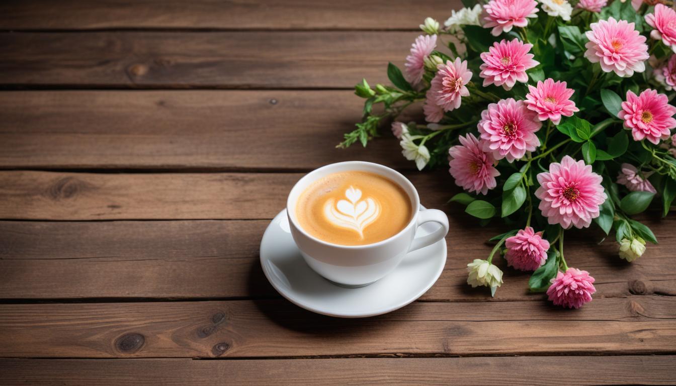 A cup of coffee sits on a wooden table next to vibrant pink flowers, bringing warmth and a relaxing ambiance to the setting.