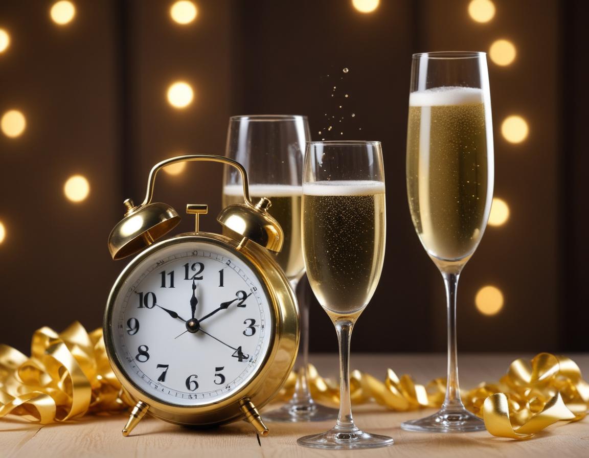 bubbles, celebration, celebration setting, champagne, clock, countdown, drinks, elegant, evening, event, festive, gold, joyful, new year, party, party time, sparkling, toast, tradition, warm lights
