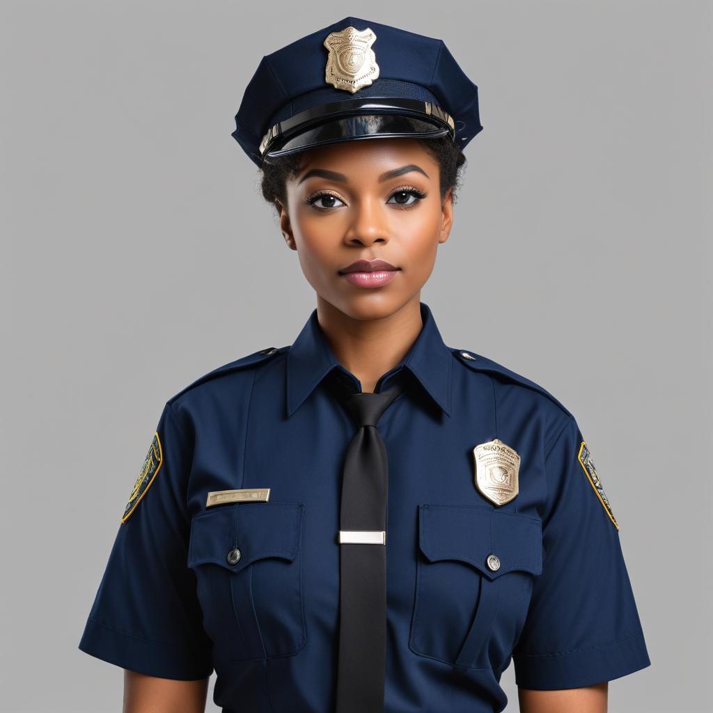 A police officer stands proudly in her uniform, showing commitment and professionalism against a neutral background.