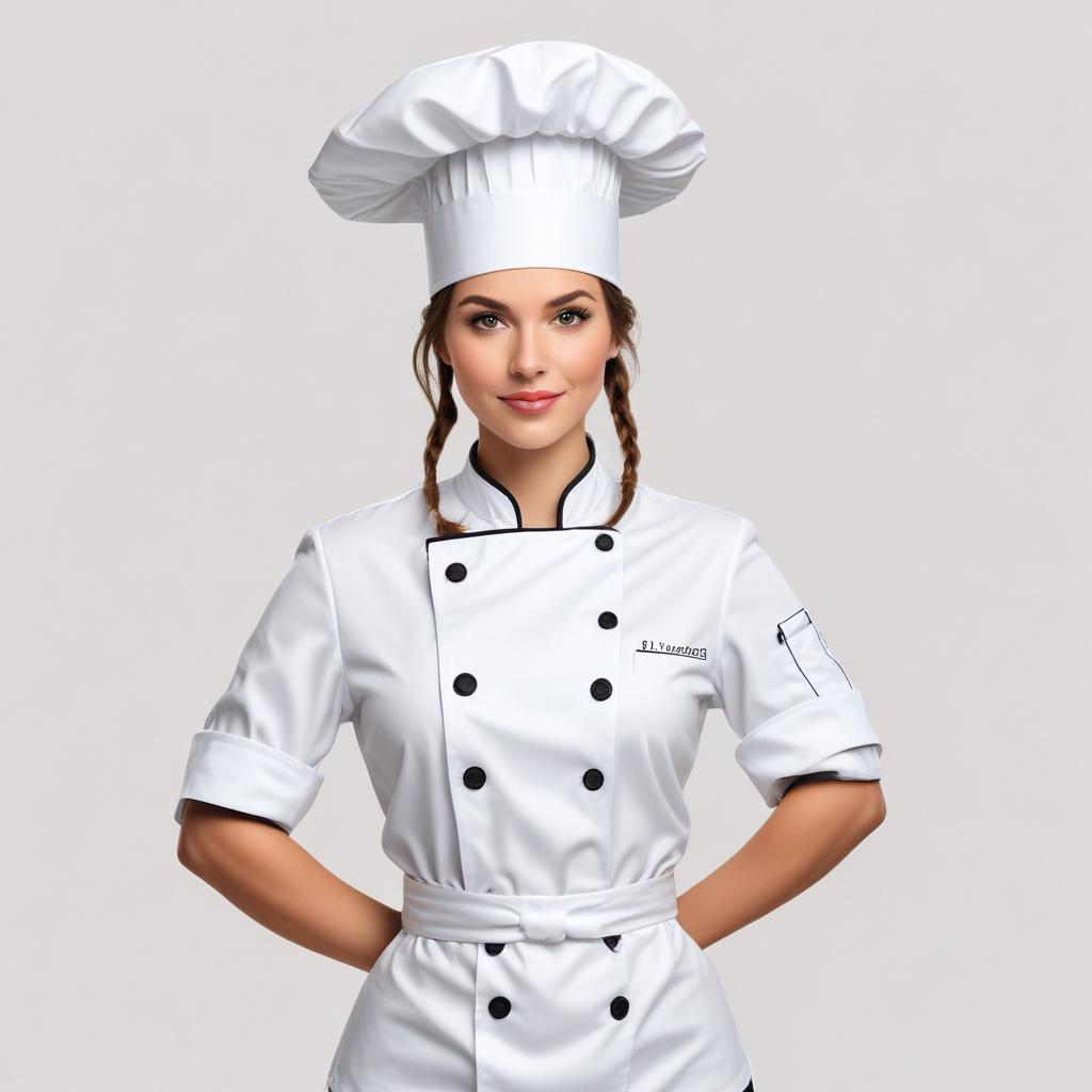 A skilled female chef stands confidently in a clean kitchen, wearing a classic white uniform and chef hat, ready to cook delicious meals.