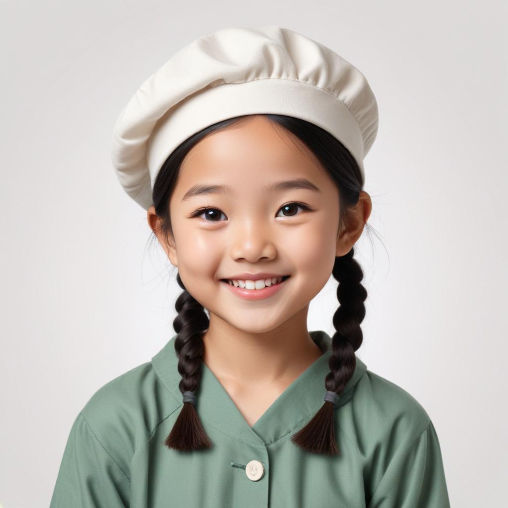 A cheerful young girl wearing a chef hat and a green uniform smiles brightly, ready to start cooking in her kitchen.