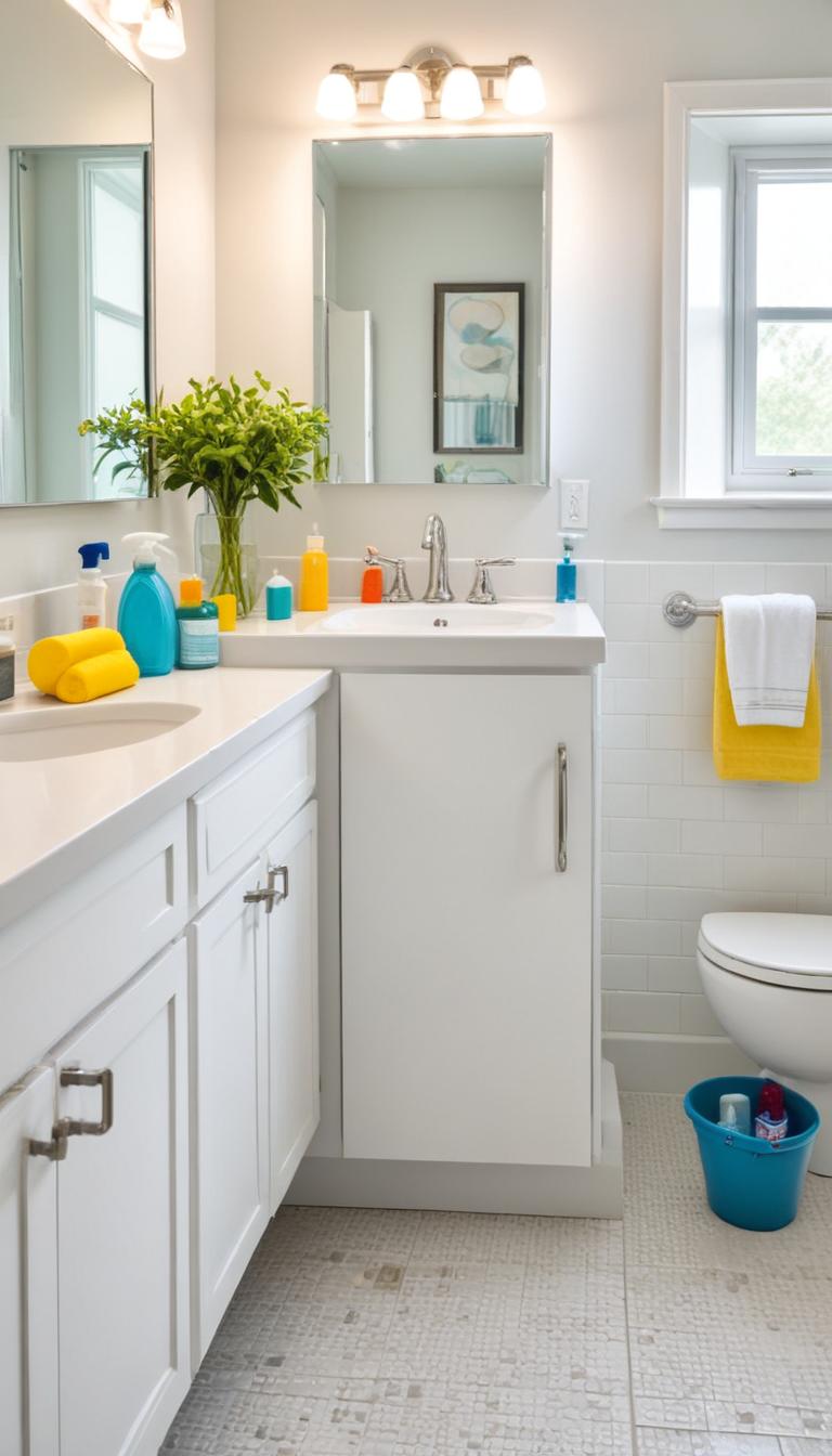 bathroom, blue, bright, clean, colors, decor, design, fixtures, fresh flowers, home, interior, lighting, modern, organized, relaxation, sink, space, stylish, towels, yellow