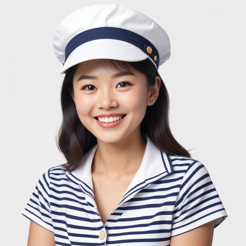 A woman poses with a bright smile, wearing a striped shirt and nautical cap, showcasing a cheerful and stylish look.