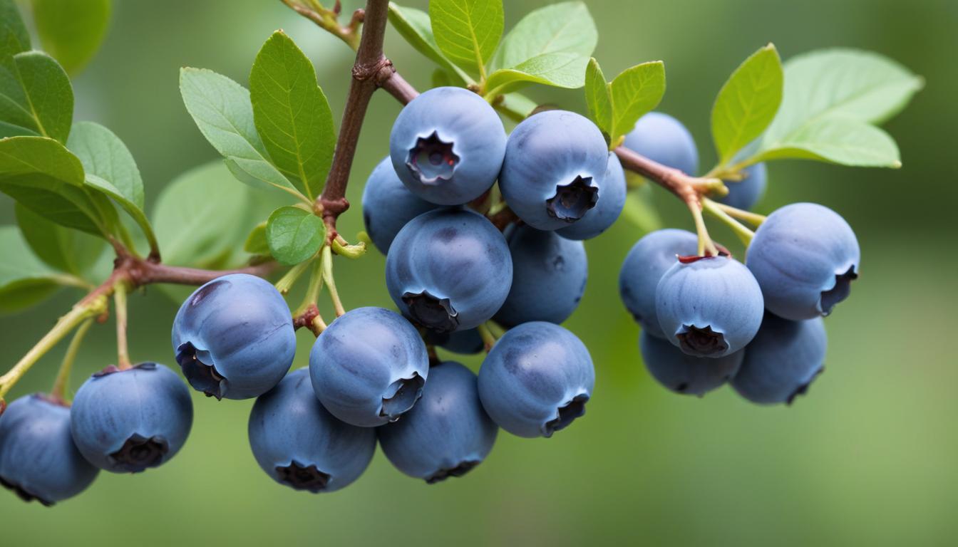 Fresh blueberries hang from green branches in a garden setting, surrounded by vibrant leaves. The fruit is ripe and ready for harvest.