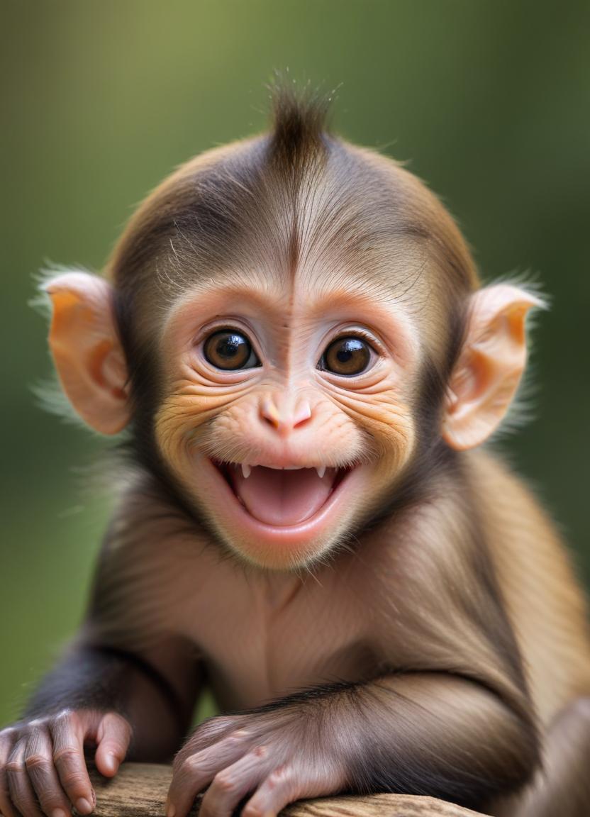 Cute baby monkey smiling happily in a forest setting