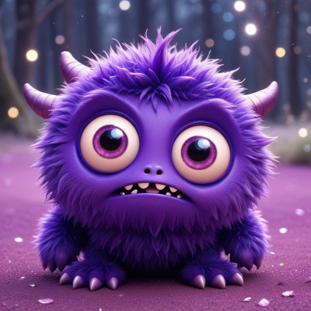 adorable, animated character, big eyes, cartoon style, cute character, cute design, enchanting, fantasy setting, fluffy creature, forest background, friendly monster, fun design, imaginary creature, magical atmosphere, magical forest, nature scene, playful, purple monster, soft light, whimsical