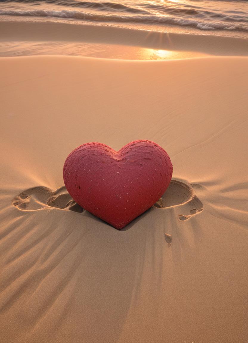 A large heart-shaped decoration sits on the sand as sun sets, casting warm colors and creating a romantic atmosphere by the water.