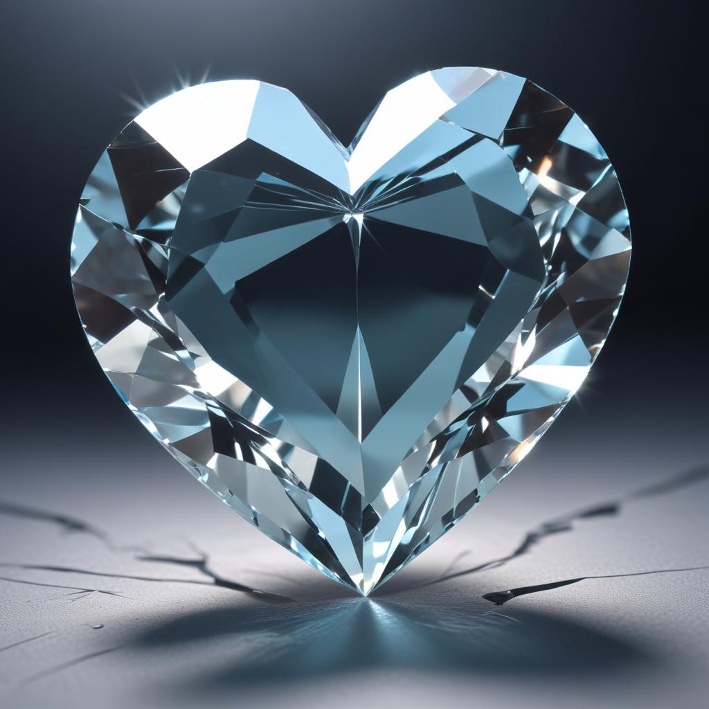 A heart-shaped crystal glimmers in soft light, highlighting its facets and reflections. The surface shows cracks adding texture.