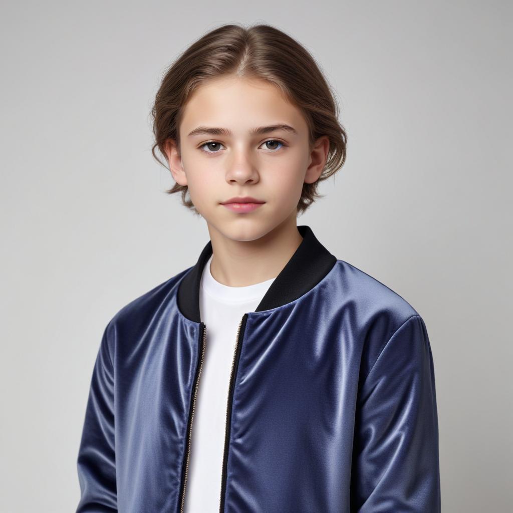 A young boy poses confidently in a blue satin jacket against a neutral backdrop. His expression shows calm and poise.