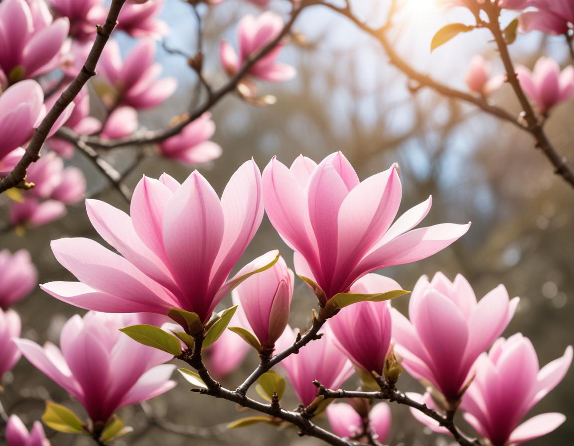 Magnolia flowers bloom in varying shades of pink, illuminated by warm sunlight during a vibrant spring day.