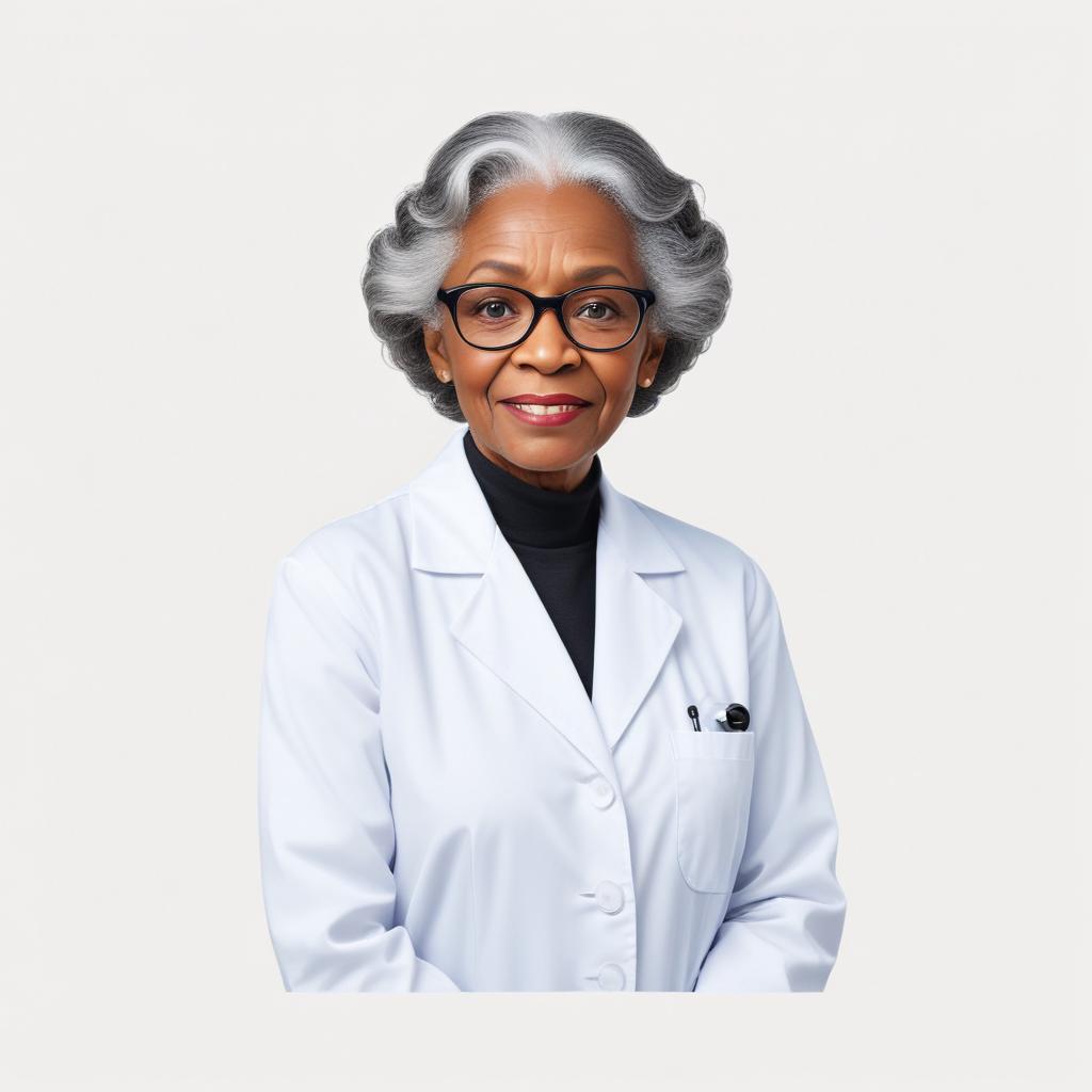 A senior doctor stands confidently in a white coat and glasses. She has curly gray hair and smiles warmly, embodying professionalism.