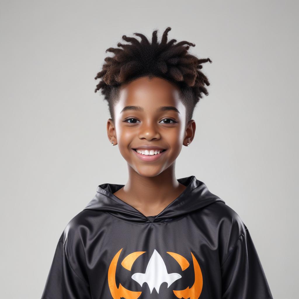 A cheerful boy stands against a plain background, showcasing his stylish hoodie. He has a joyful expression and fun hairstyle.