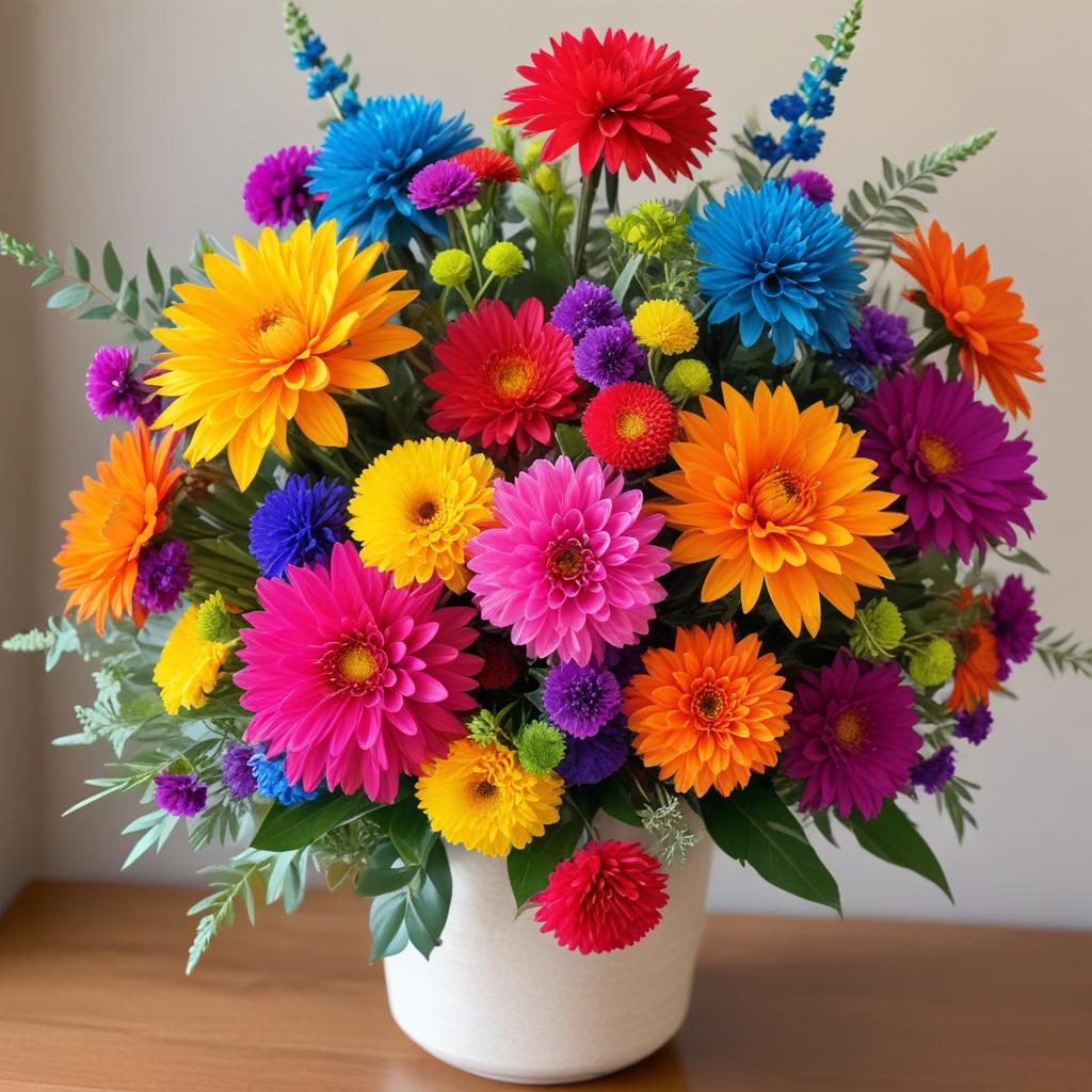 A vibrant bouquet of mixed flowers showcases bright colors and textures, adding cheer to the room with its lively display of blooms.