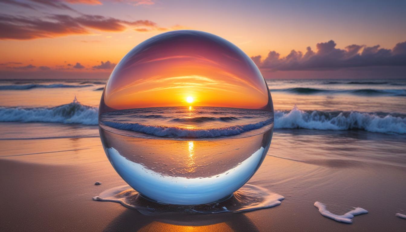 The sun sets over the ocean, casting vibrant colors reflected in a glass sphere resting on the wet sand, waves gently lapping at its base.