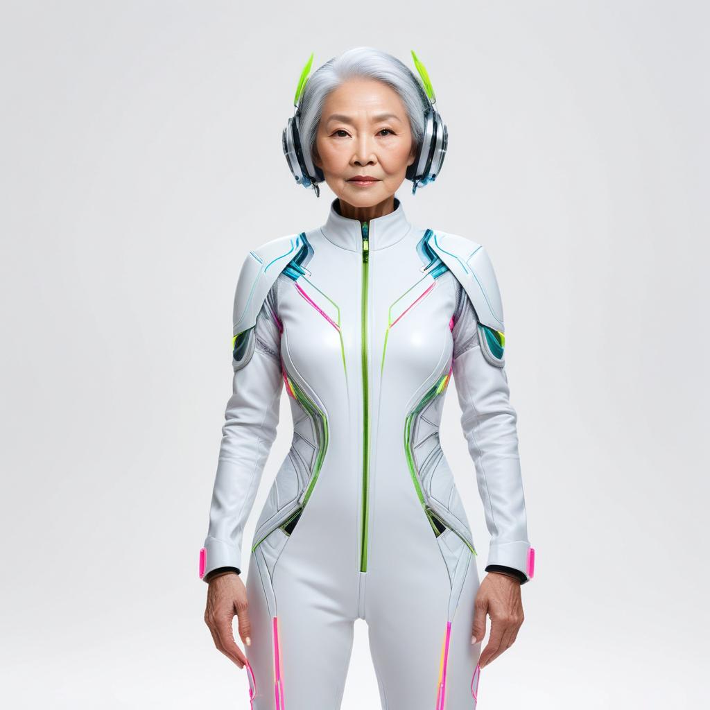 A confident woman stands in a vibrant, futuristic outfit and stylish headphones, embodying strength and innovation in a minimalist setting.