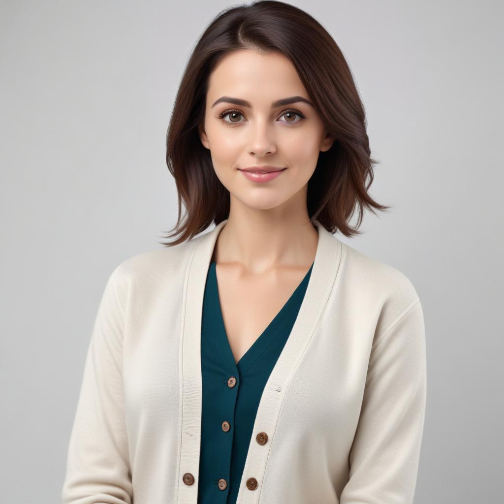 Woman with light cardigan smiling against gray background