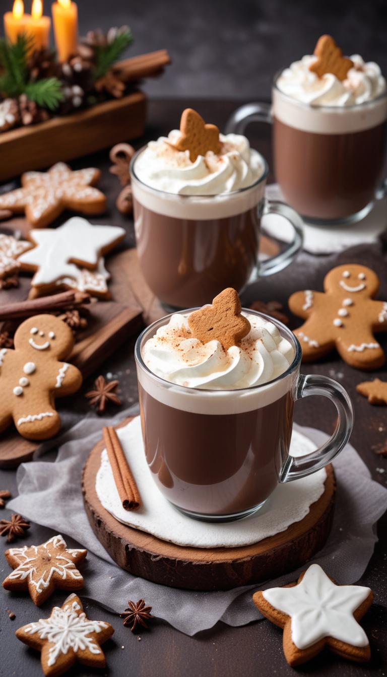 baking, celebration, chocolate, cinnamon sticks, coffee mugs, comfort food, cozy, decorations, dessert, festive, gingerbread cookies, holiday drinks, homemade, hot chocolate, seasonal, sweet treats, sweets, table setting, whipped cream, winter