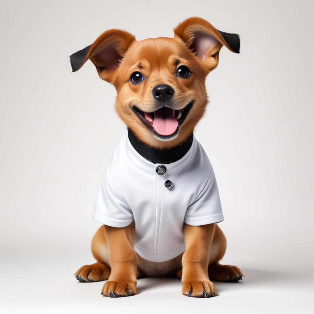 A small, happy puppy poses in a cute outfit, sitting on a plain background with a cheerful expression, creating a playful atmosphere.