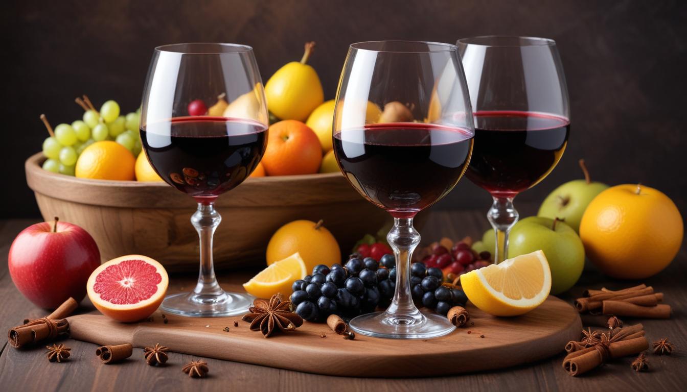 Three glasses of red wine sit on a wooden board next to a variety of fresh fruits, creating a warm and inviting atmosphere.