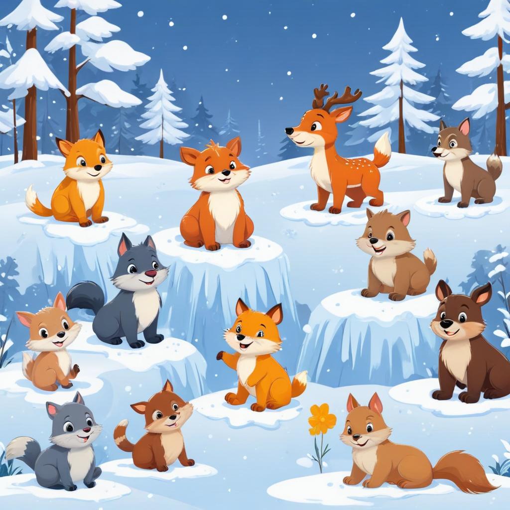 Cute cartoon animals gather in a snowy forest, including foxes, a deer, and wolves, enjoying a winter day filled with fun and play.