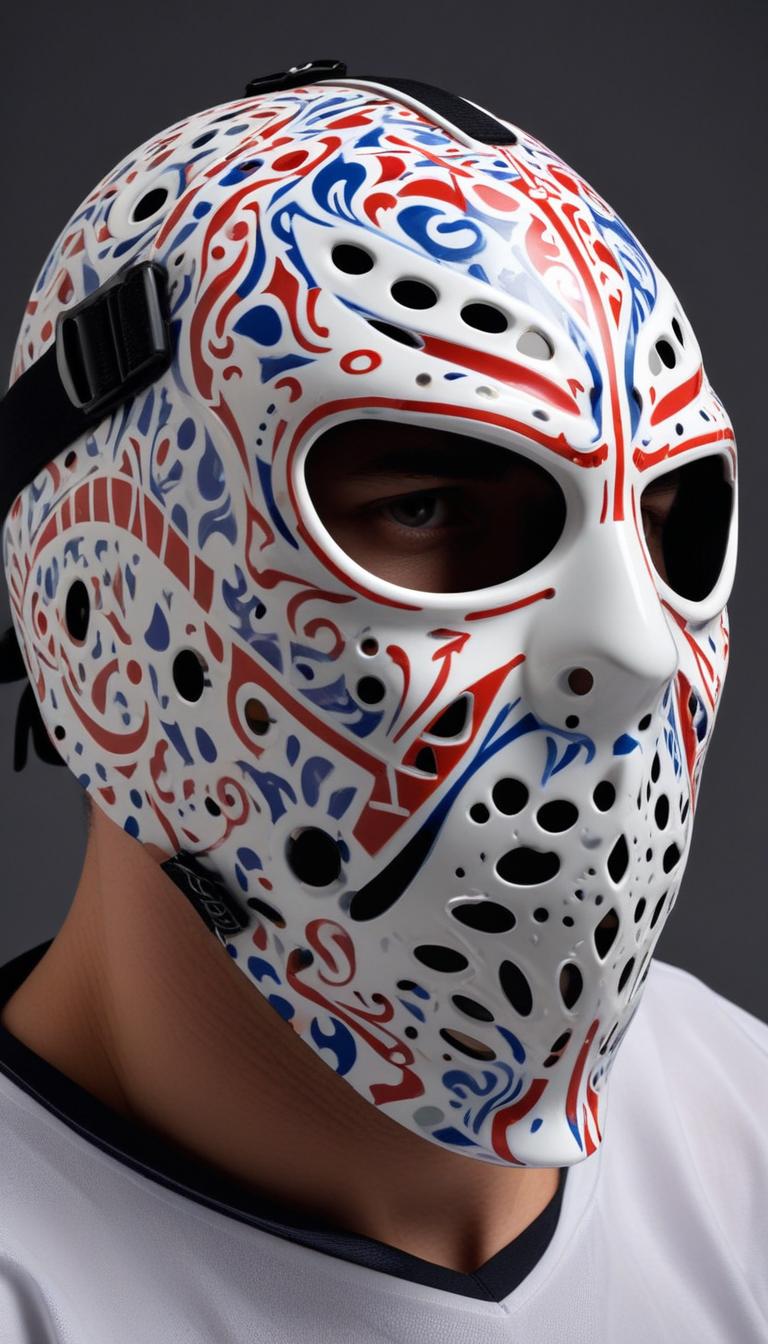 art piece, blue, bold colors, close-up, collector item, craftsmanship, creative design, decorative design, detailed pattern, display, headgear, hockey, hockey mask, mannequin, mask art, protective equipment, red, sports gear, sporty fashion, unique art