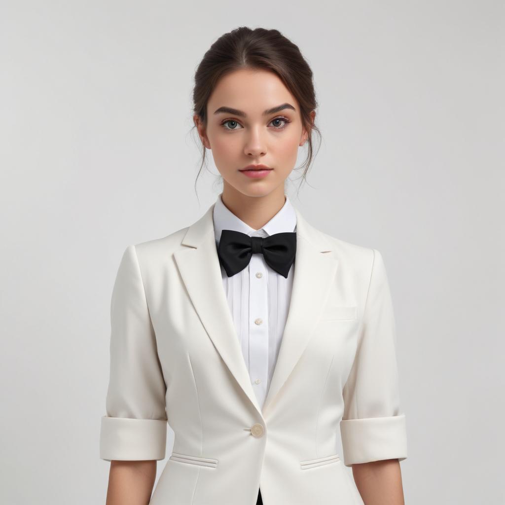A sophisticated woman wears a tailored white suit with rolled sleeves and a black bow tie, showcasing a refined style and confidence.