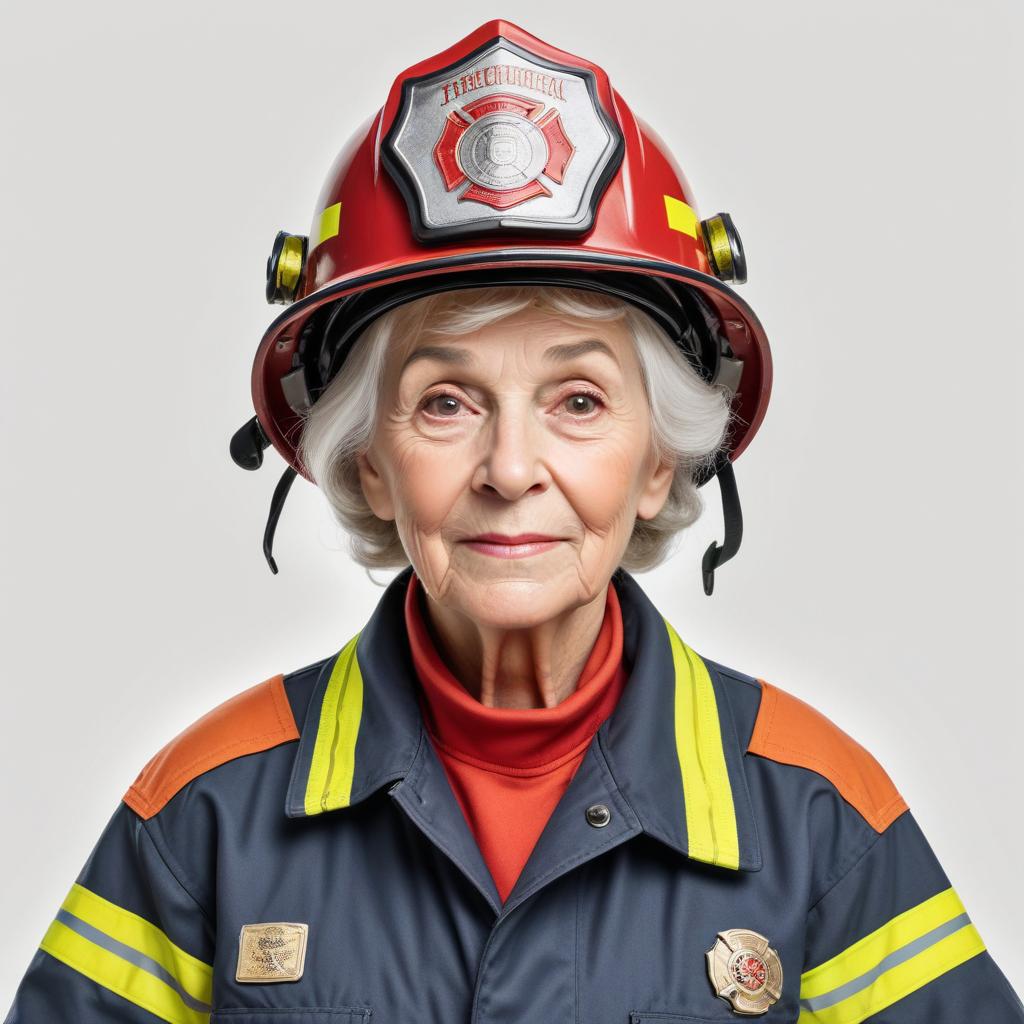 A senior woman poses confidently in a firefighter uniform and helmet, showcasing her commitment to the fire service and community.