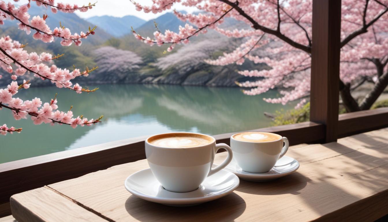 Two cups of coffee sit on a wooden table by a serene lake with cherry blossoms in full bloom. The setting is calm and picturesque.