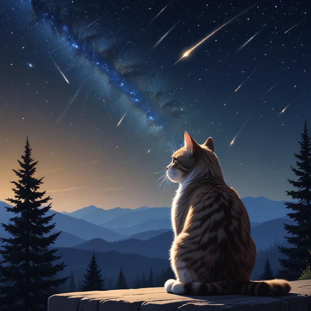 A striped cat sits on a ledge, watching shooting stars across a starry night sky surrounded by mountains and trees.
