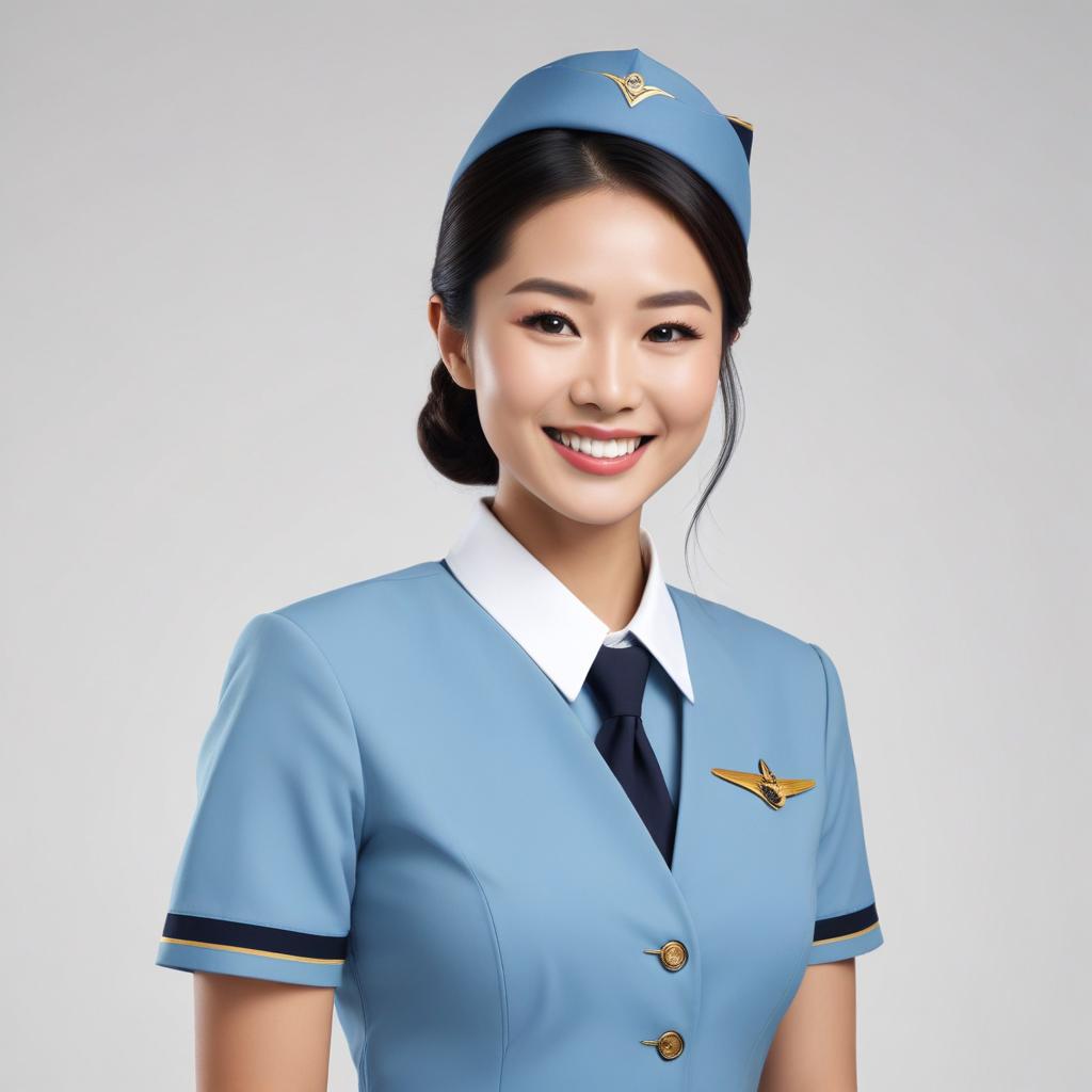A flight attendant stands smiling with a welcoming demeanor in a light blue uniform, showcasing professionalism and warmth in her appearance.