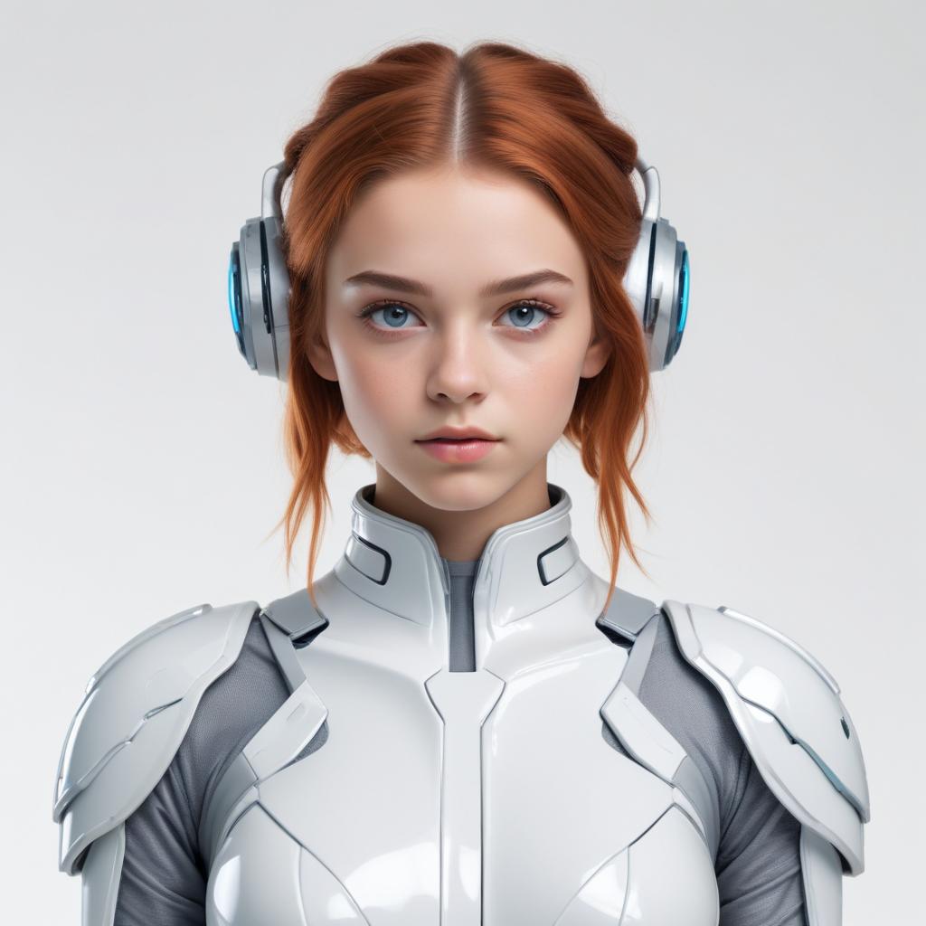 A young woman stands confidently in sleek white armor. High-tech headphones rest snugly on her head, suggesting an advanced setting.