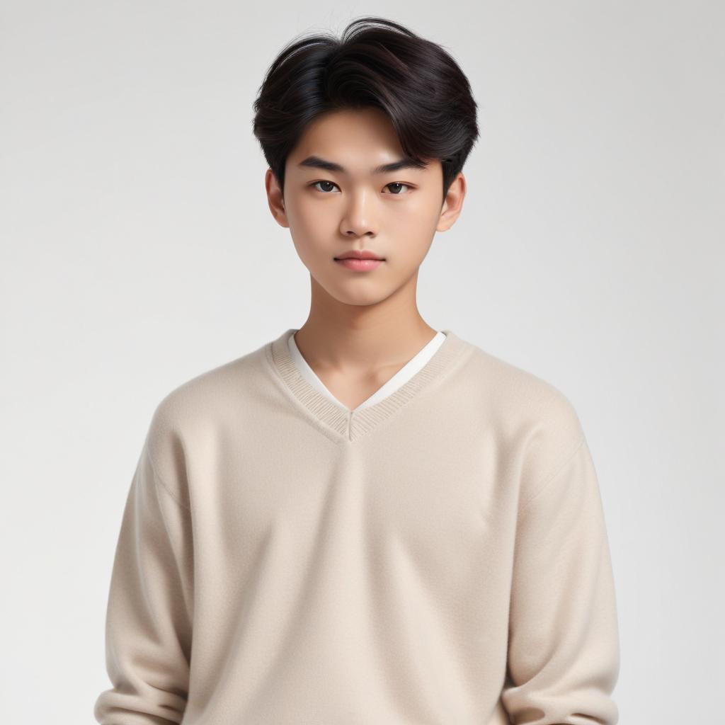 A young boy stands confidently while wearing a light sweater. He has a thoughtful look and a neutral background that emphasizes his features.