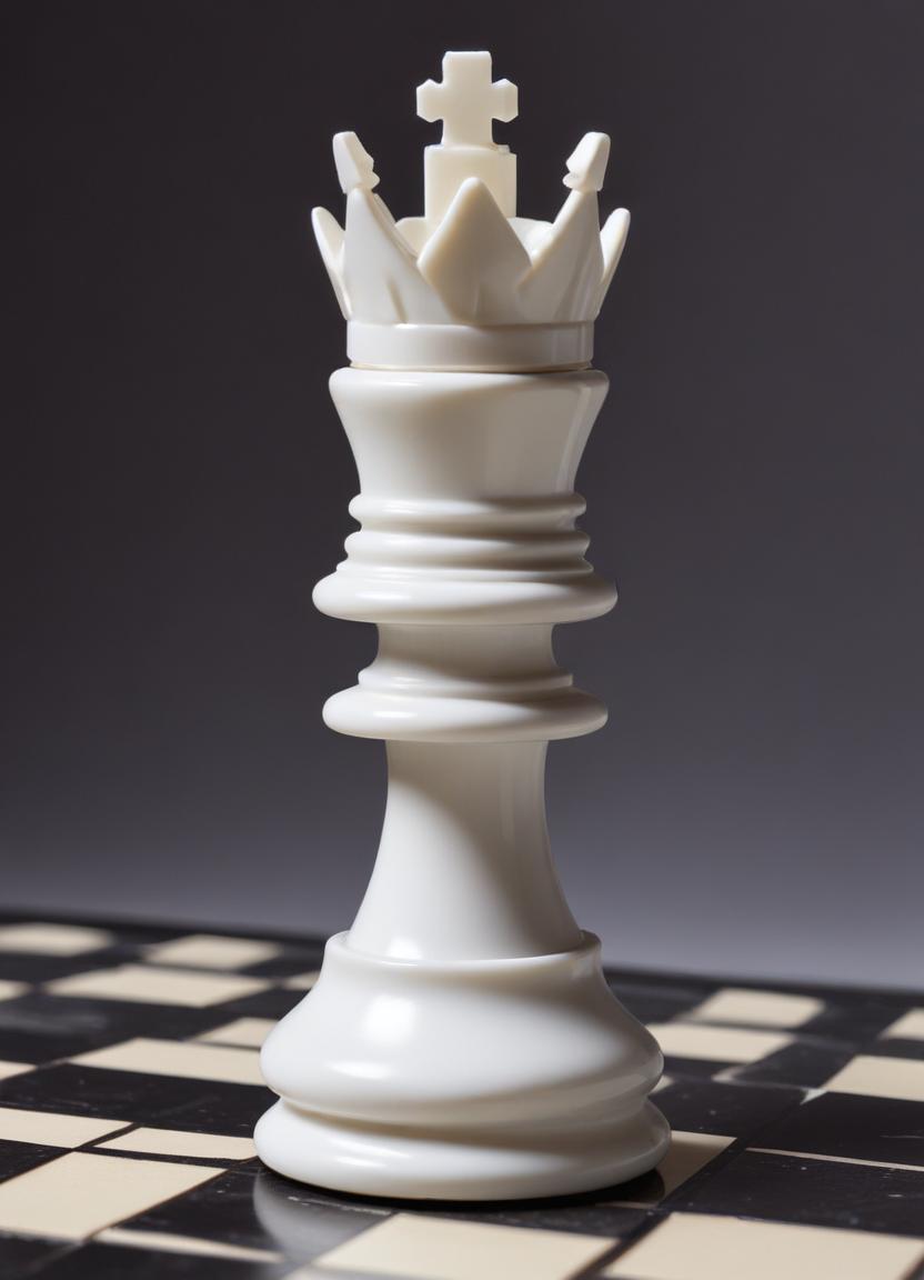A white king chess piece stands tall on a classic black and white chessboard, highlighting its distinct shape and elegance.