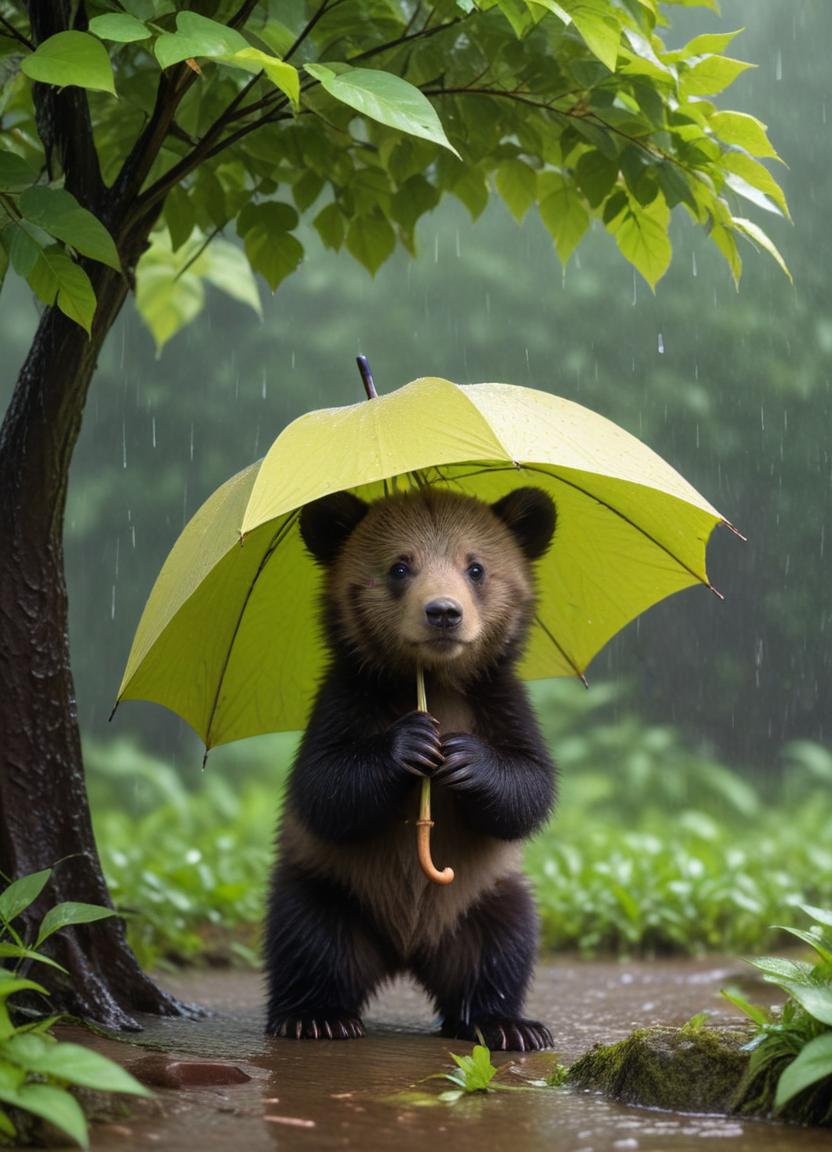 adorable, animal, bear, cub, cute, droplets, environment, forest, furry, green, leaves, nature, path, rain, shelter, small, tree, umbrella, wet, wildlife