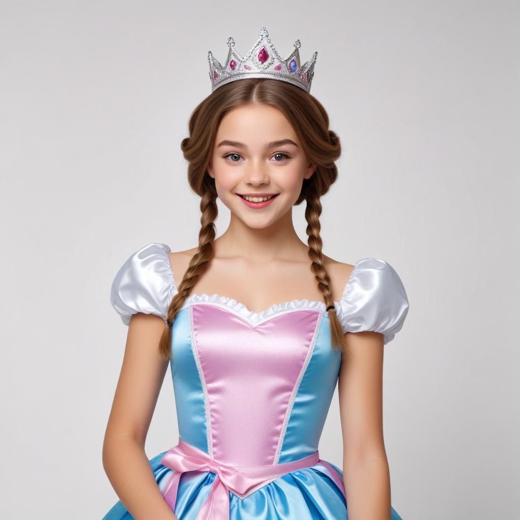 A girl wears a colorful princess dress and crown, smiling happily while posing in a studio setting, perfect for a costume party or event.