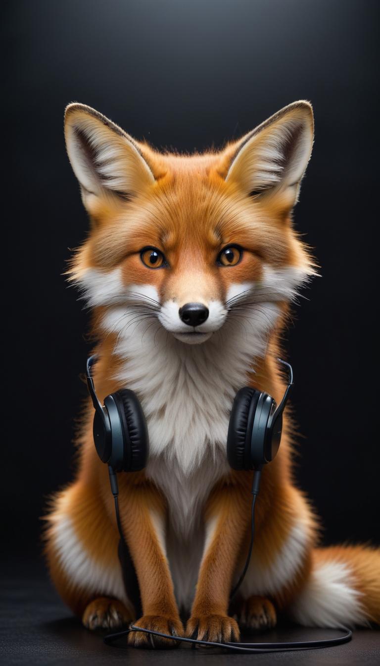 A fox is seated calmly, wearing headphones, with a dark background highlighting its features and curious expression.