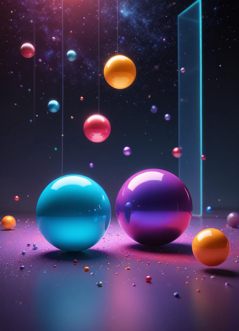 Vibrant spheres of different colors float in a dark cosmic environment, creating a stunning visual display of shapes and light.
