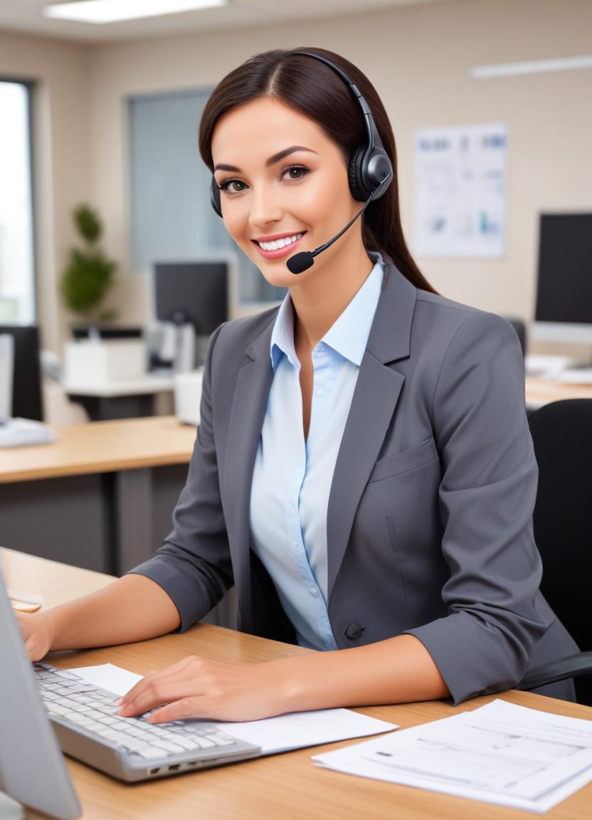 assistant, businesswoman, communication, computer, corporate, customer service, desk, employee, headset, interaction, modern workspace, office, office environment, phone call, productivity, professionalism, smiling, technology, typing, work
